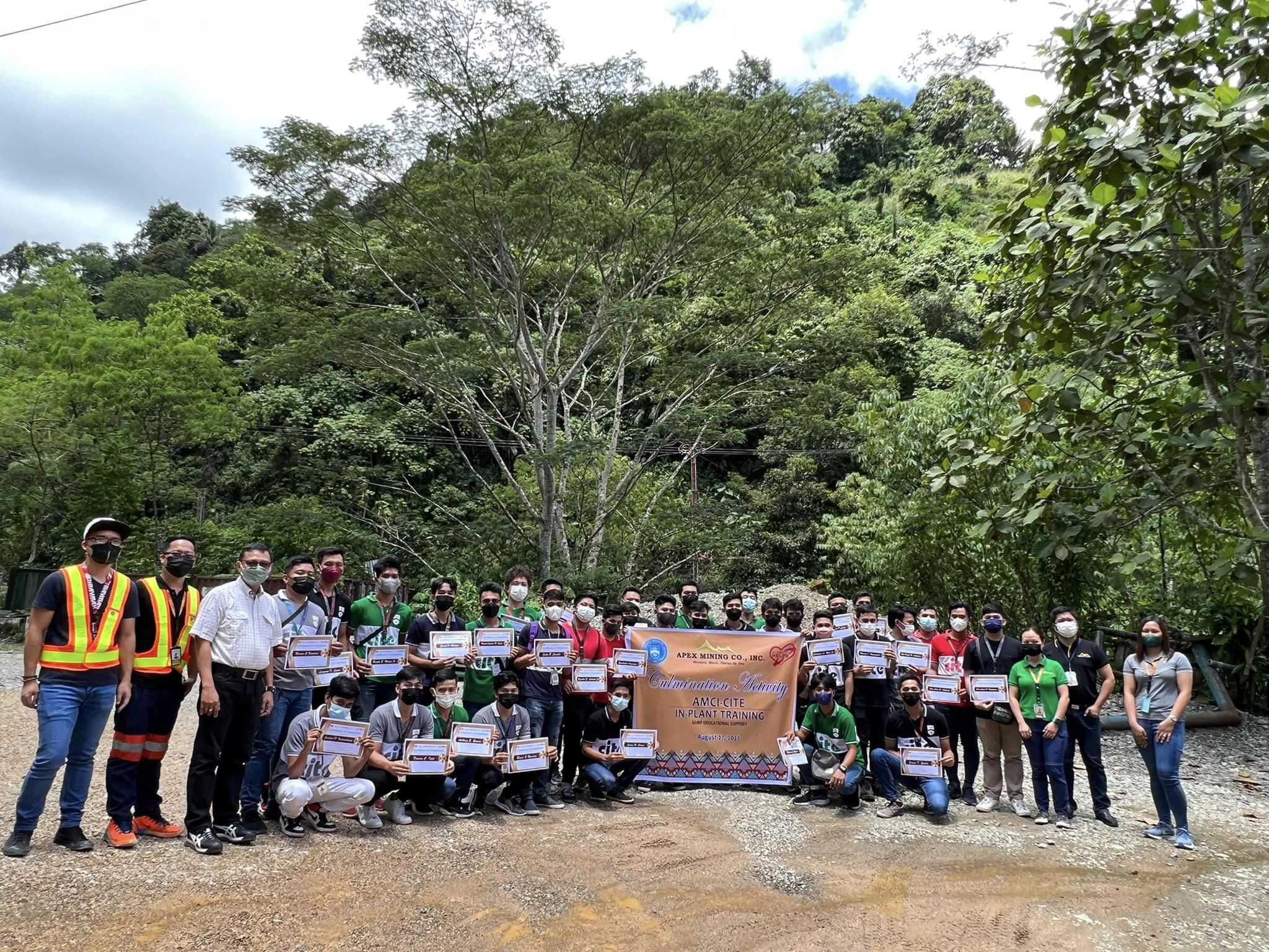 Some 34 diploma program trainees of Apex Mining Company in Masara, Davao de Oro finished their one year in-plant training on August 27, 2022. A culiminating activity was held to celebrate the success of the program despite being punctuated by the pandemic. In attendance were officials of Apex Mining, parents, and officials from CITE represented by Industry Linkage Unit Manager Jon Mercado. The training was delivered through the Dual Training System yielded future employment to the second batch of graduating students sponsored by Apex Mining. This batch includes Alvieh Jay Abelleja, Jhon Carl Abelleja, Mc Darel Achivida, Rey Aet, Jayvee Alonsagay, Chandler John Arnejo, Arniel Bagani, Jefferson Borigon, Dante Bustamante, Jerson Calma, Lyle Junn CaƱete, Marjun Fronteras, Anthony Guarin, March Jaylord Gujol, Peito Hiolen, Jr., Francis Intia, Gaveheart Lagnason, Llandro Lagria, Elpedio Lamano, Jr., Johny Laos, Mike Louie Lasco, Cyril Longno, Lorgenes Lucas, Jayford Magdilag, Marvin Magurinda, Marvin Matas, Gaudioso Rabe, Jr., Bryan Ramirez, Clifford Responso, Joesel Retiza, Judy Sevilla, Jem Rix Siges, Nelmar Sosas, Junbert Ventosillada, John Loyd Victoriano, and Jerome Zabate.